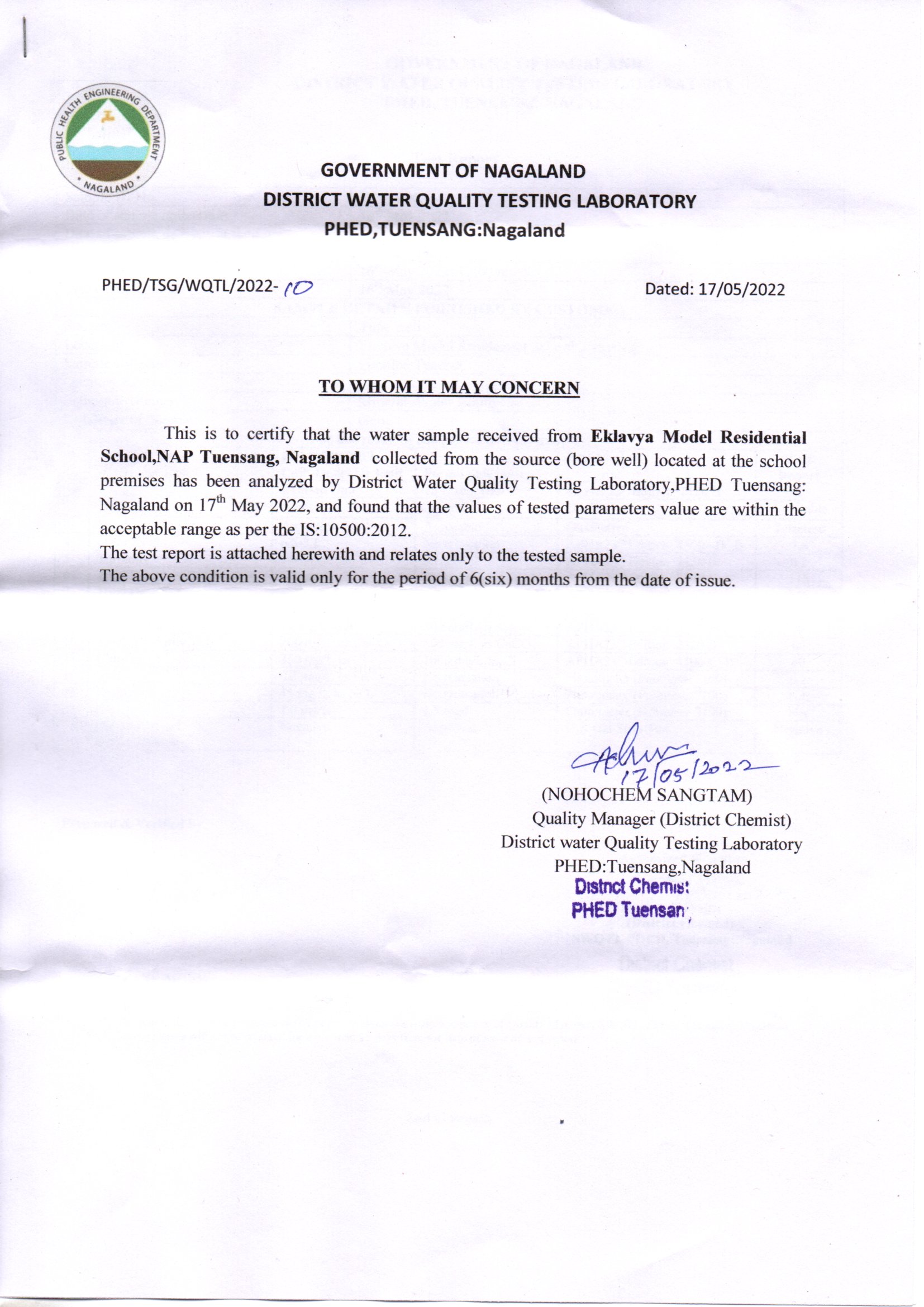 water testing certificate